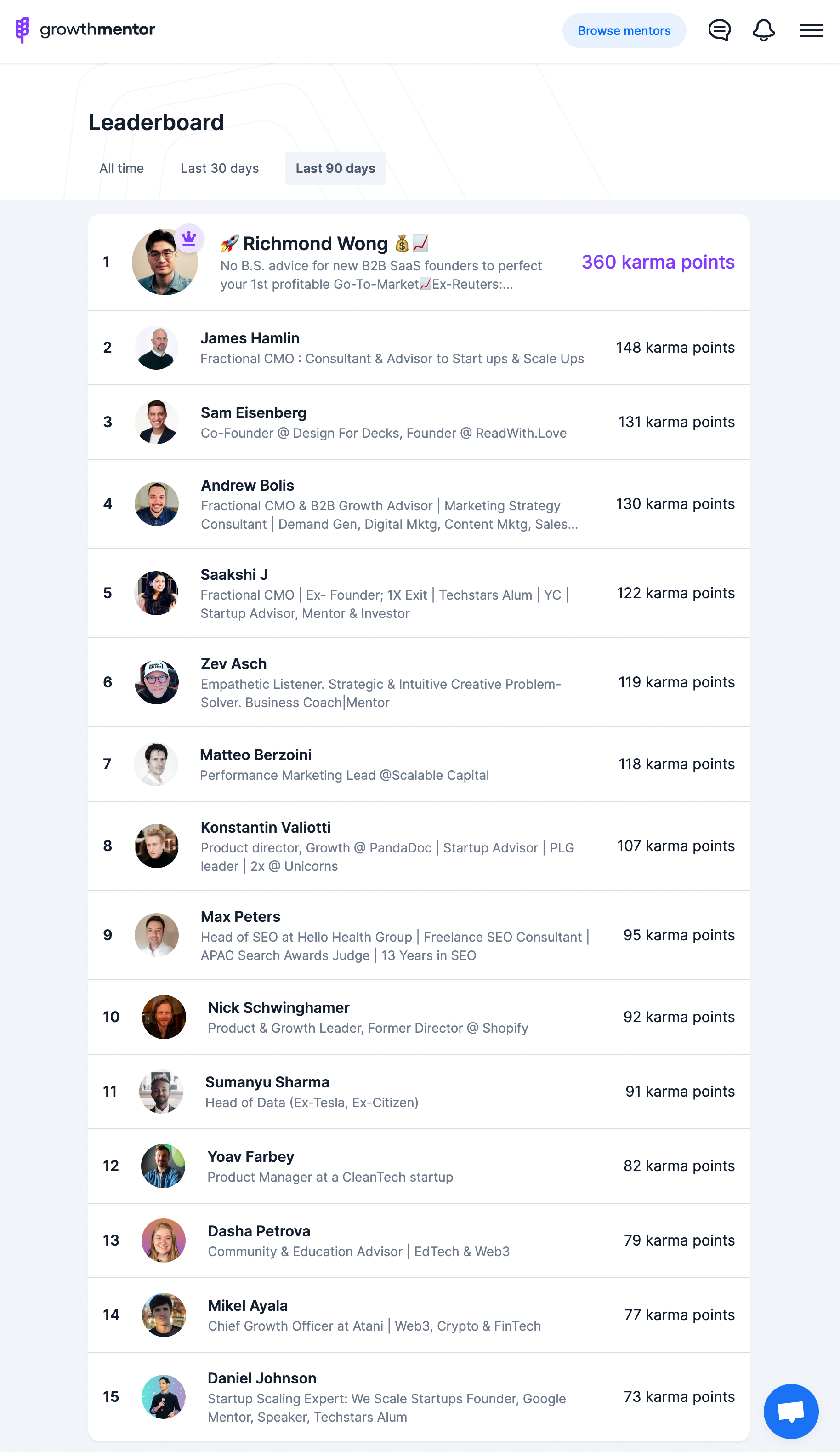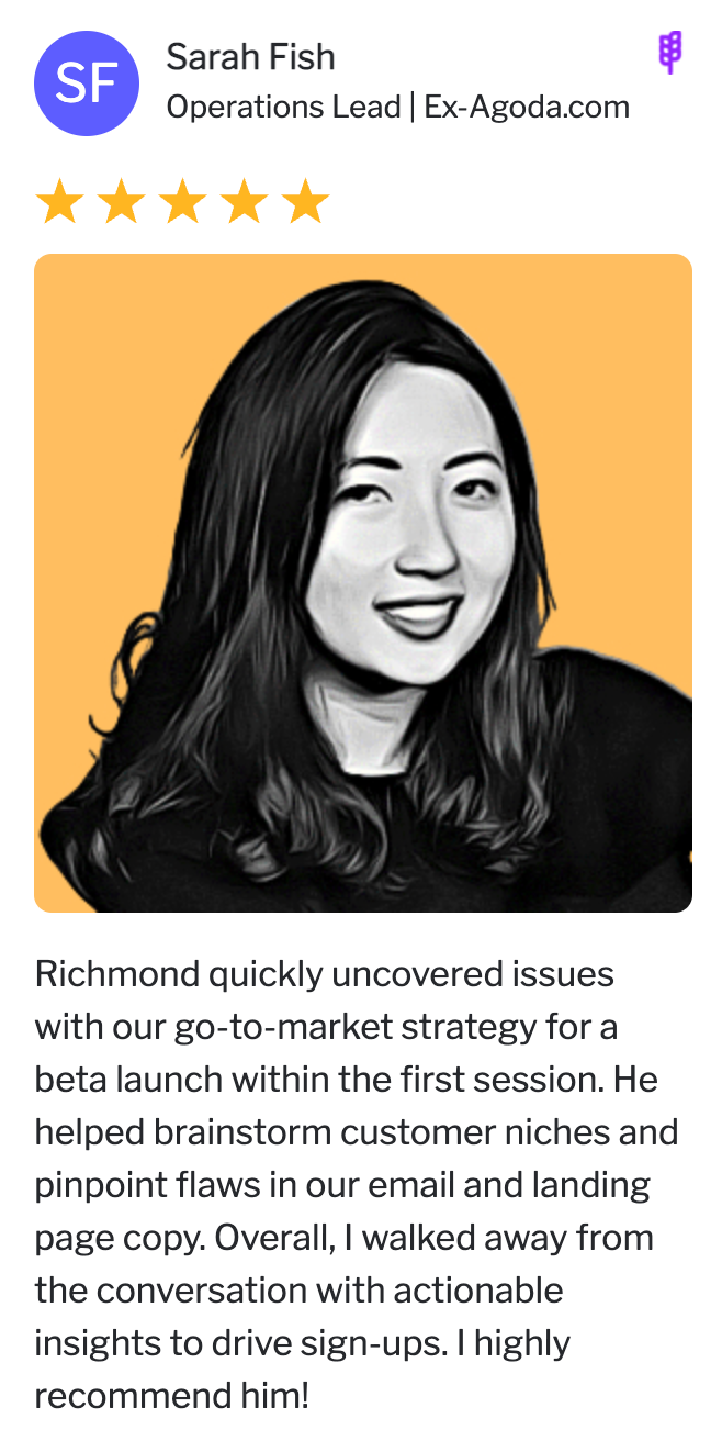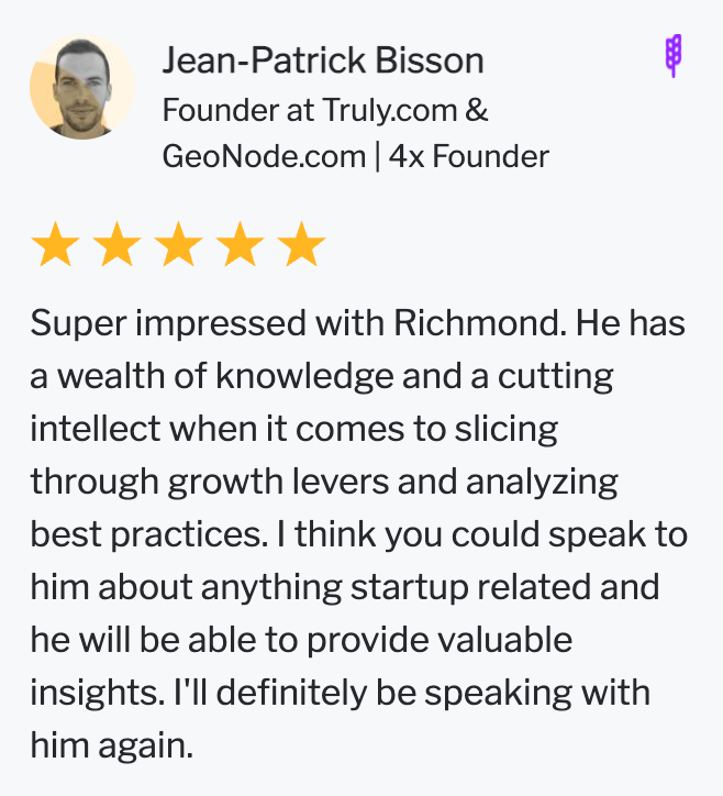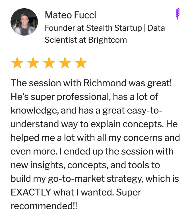 I’m also one of the most requested and highly ranked (4.9+ stars) mentors on Growth Mentor, an invite-only platform that pairs early-stage founders with Go-to-Market and other mentors from Google, Tesla, Shopify, News Corp and Semrush.
